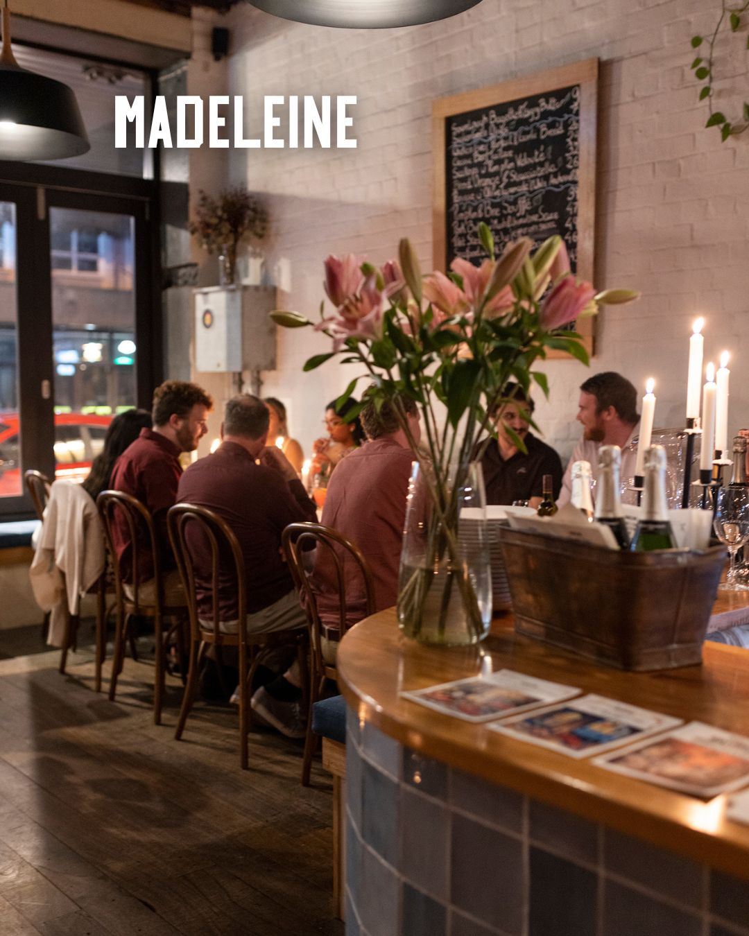 Madeleine’s atmosphere is unlike any other. By day, our rear dining room is a bright, peaceful space that opens onto a serene garden courtyard. By night, it becomes an intimate, candlelit setting with rustic charm — a perfect blend of comfort and sophistication.